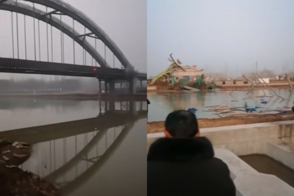 A video shared by netizens showed the collapse of a large bridge under construction, with an engineering vehicle overturned on the broken bridge, and a large amount of construction materials scattered on the water surface. In the video, a man shouted, “It’s serious, quickly save people, go down and rescue them,” and “The Yuegang Bridge is broken.”