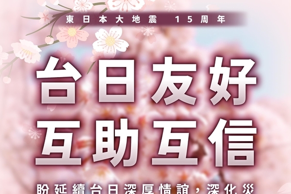 Taiwan President Tsai Ing-wen stated today that it has been 15 years since the Great East Japan Earthquake. Taiwan and Japan are both members of the earthquake-prone zone, with deep historical connections and strong civilian friendship. Tsai expressed his sincere hope for deepening substantive cooperation between Taiwan and Japan in disaster prevention, humanitarian assistance, and social resilience based on these foundations.