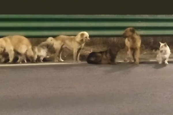 According to reports from various Chinese media outlets including Urban Express and Elephant News, on March 16, a sedan driver near Changchun Changshuang Expressway captured footage of the seven dogs walking together on the roadside.