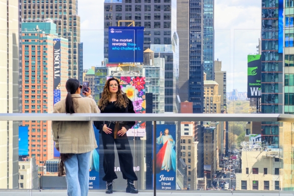 The new experience is located on the 19th floor, accessible by a glass elevator, providing a 360-degree panoramic viewing platform and a glass walkway for visitors to overlook Times Square from high above. The view spans across the Manhattan streets between the Hudson River and the East River, offering a glimpse of the “Manhattanhenge” phenomenon during the summer.