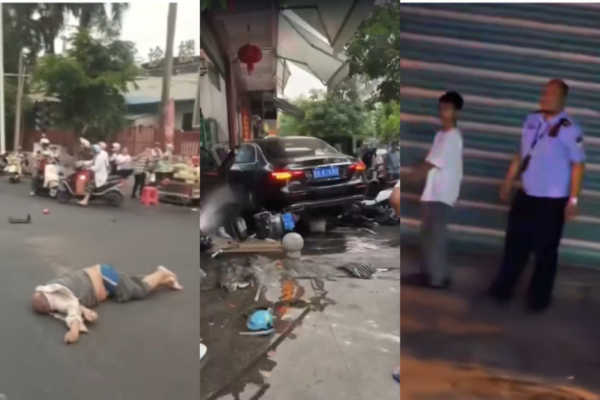 Several online videos have circulated, showing an elderly person unconscious on the road, a black Mercedes-Benz crashed onto the steps of a supermarket entrance, several motorcycles around were destroyed, and there was a trail of blood under the car’s front wheel, indicating someone may have been injured in the collision.