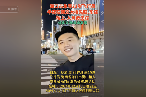 Recently, a woman named Yang from mainland China posted a video on social media claiming that her boyfriend, Sun, who works as a civil aviation pilot, disappeared after parking his car on the side of the road at Haiwen Bridge in Haikou, Hainan, around 11 p.m. on December 13. According to reports, there were 11 cars that passed by before Sun went missing, and Yang appealed to the car owners to provide any information they might have.
