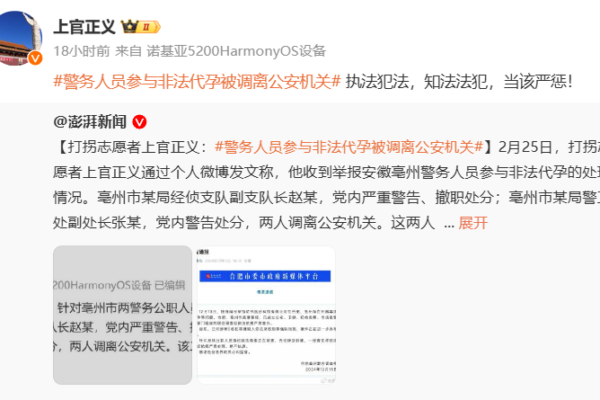 Chinese anti-human trafficking volunteer Shangguan Zhengyi posted on his personal Weibo on February 25 that he had received information about the handling of the report regarding law enforcement personnel in Bozhou, Anhui, engaging in illegal surrogacy.
