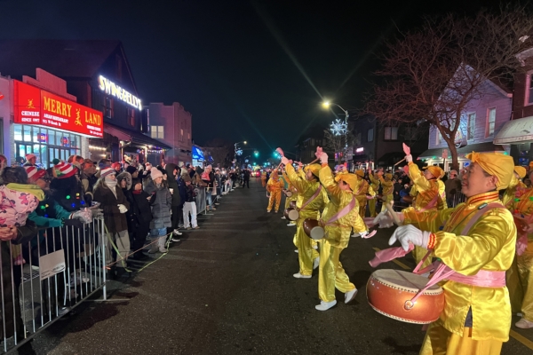 The Falun Dafa Waist Drum Team, dressed in bright goose-yellow traditional costumes with pink ribbons tied around their waists and drumsticks, performed energetically. They played “Falun Dafa Is Good”, “March of the New China”, and Christmas carols like “Jingle Bells,” with powerful drumbeats that lifted spirits. The lively cheers and applause from the spectators along the route were continuous and enthusiastic.