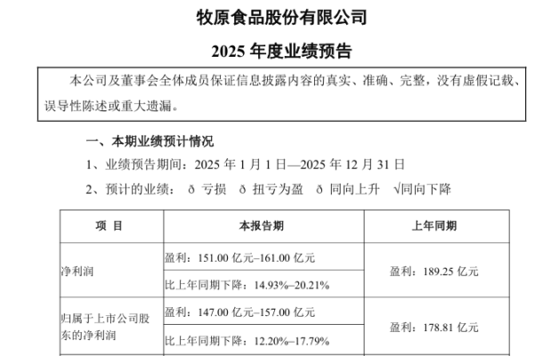 Muyuan Food Co., Ltd. (Muyuan Group) announced on January 16th that the company expects a decrease in net profit for the year 2025 ranging from 12.2% to 17.79% compared to the previous year. At the same time, the net profit attributable to shareholders of the listed company, after deducting non-recurring gains and losses, is expected to decline by 14.12% to 19.45% year-on-year.