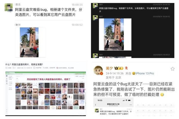 On the evening of September 14th, several netizens posted claiming that there was a “BUG” on Aliyun Drive. Users discovered that in the album function of Aliyun Drive, simply creating a folder and then selecting images from the classification would load numerous photos from other users’ cloud drives, including selfies, landscape photos, and travel photos.