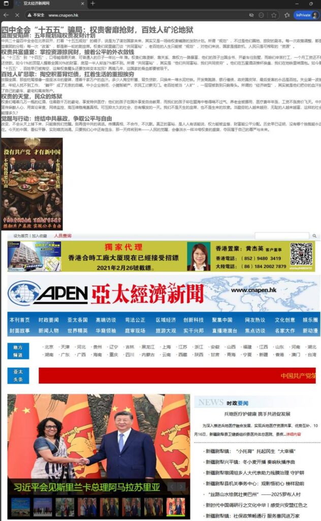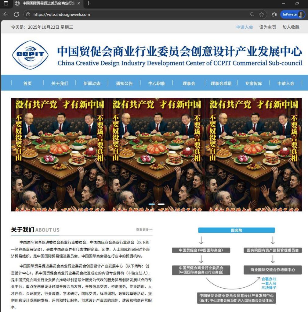 Anonymous 64 announced on X on October 22 that it had relaunched operations, with its first wave targeting four websites including the China Council for the Promotion of International Trade’s Creative Design Industry Development Center and Asia-Pacific News Economy, planting slogans such as “Without the Communist Party, there can be a new China” on their homepages. The group claimed it intercepted confidential talks among top-level CCP officials and accused the “15th Five-Year Plan” of being a “blueprint turned scam.”
