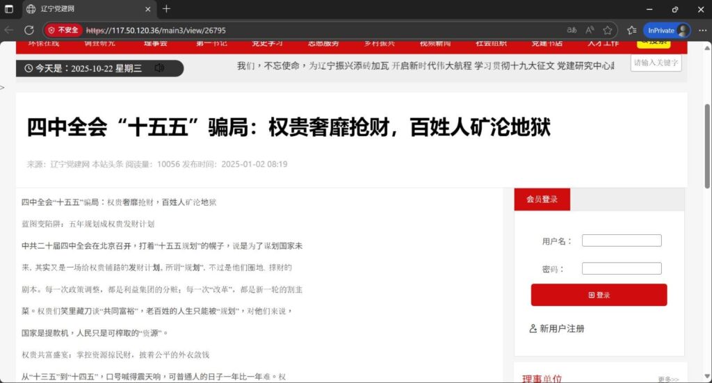According to images released by Anonymous 64, the hacked homepages were replaced with anti-CCP graphics and lengthy articles that dissected the meeting agenda point by point, accusing the authorities of using “common prosperity” to mask resource monopolies. Anonymous 64 said it would submit the intercepted materials to international human-rights organizations and media outlets for verification, emphasizing “let the truth be revealed to the world.”
