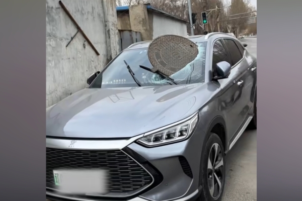 According to the Yangzhou Evening News, around 10 a.m. that day, a white SUV was driving ahead normally, followed by a BYD car. Suddenly, a dark object flew up and directly hit the windshield of the BYD car, creating a loud bang as the unidentified object smashed through the glass and partially into the driver’s compartment – revealing to be a manhole cover.