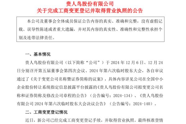 In the announcement released by Guireniao on the completion of industrial and commercial registration changes and acquisition of business license, it stated that the new company has completed the procedures for industrial and commercial registration and obtained a business license. The approved name is Jinhe Agricultural Co., Ltd., with a registered capital of 157,150,535.8 million RMB.