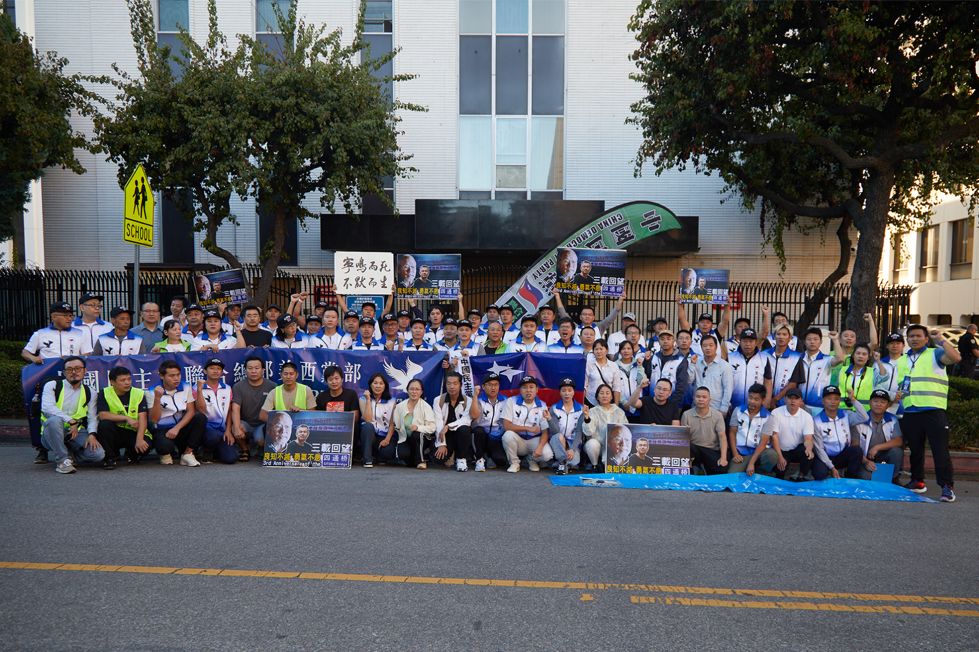 Last Sunday afternoon, dozens of Chinese gathered in front of the Chinese Consulate General in Los Angeles to hold a commemorative event with the theme “Looking Back at the Four Tunes Bridge: Conscience Endures, Courage Persists,” in support of Peng Lifa, who three years ago in Beijing’s Four Tunes Bridge, protested with his own body, and in memory of Wan Runnan, a pioneer of thought with connections to the “Four Tunes.”