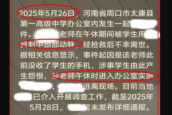 On May 26th, a tragic incident occurred at the First Senior High School in Taikang County, Zhoukou City, Henan Province, where a senior high school student fatally stabbed his homeroom teacher. The student also sustained injuries during the altercation and is currently undergoing treatment at a hospital in Zhengzhou. Chinese authorities have imposed a complete censorship on this news.