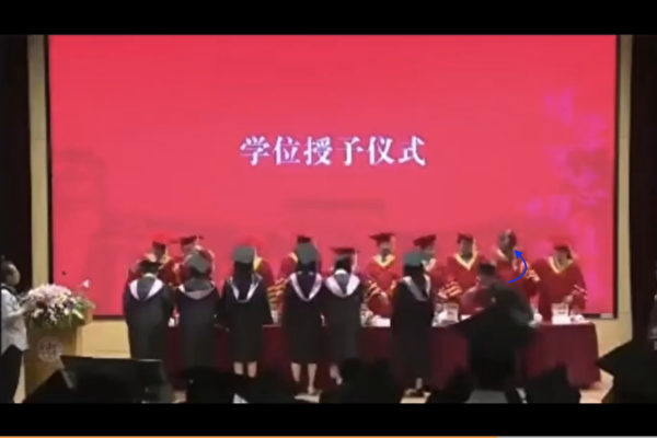 According to a video circulating online on June 19, during the degree awarding ceremony at Fudan University’s Law School, a male student went on stage and punched a teacher standing in the second position on the right before quickly leaving. The teacher’s glasses and mentor’s cap were knocked off, and another teacher standing in the first position on the right seemed startled and moved aside. After a brief pause to regroup, the ceremony proceeded.