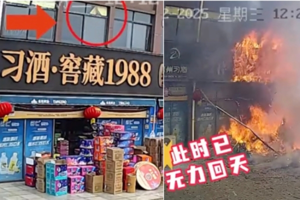 In the circulating video, a man is seen smoking on the second-floor platform of a street-facing shop in Nanyang. After finishing his cigarette, the man casually tosses the still burning cigarette butt out the window, landing directly on the fireworks and firecrackers displayed at the entrance of a shop downstairs. The video shows the black signboard of the store with the words “Xi Wine Cellar 1988 Changsheng Trading” written on it.