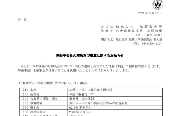 Kato Manufacturing Co., Ltd. disclosed on its website the reasons for exiting the Chinese market, citing factors such as the downturn in the Chinese real estate sector, a decrease in demand for construction machinery, intensified competition with local low-cost manufacturers, and a more challenging sales environment, making early profitability improvements extremely difficult.
