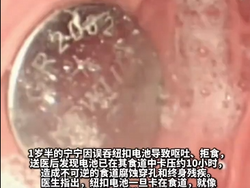 Nanjing, 1.5-year-old toddler Ningning accidentally swallowed a button battery, which got stuck in her esophagus for about 10 hours, causing irreversible corrosive perforation of the esophagus and lifelong disability. Doctors are reminding parents to be cautious of electric toys, remote controls, car keys, and other items at home.