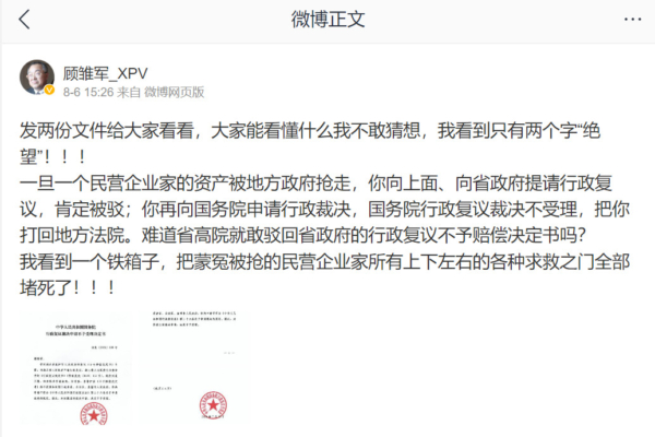 He mentioned that during his imprisonment, “Provincial and municipal governments such as Jiangsu, Anhui, Hubei, Henan, Jiangxi took the opportunity to plunder my stock holdings and management rights in these companies in those areas, as well as the remaining company’s equity, land, factories, mechanical equipment, and all other assets, leaving me bankrupt now.”