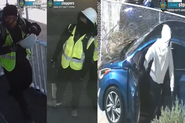The incident took place around 2:30 p.m. on October 16th in the area of 160th Street and 84th Avenue within the jurisdiction of the 107th Precinct. Surveillance footage captured two men dressed in bright yellow reflective work clothes and hard hats, with another individual wearing a white hooded sweatshirt, all with their faces covered. Initially attempting to enter through a second-floor window with a ladder, they resorted to prying open the back door to gain access to the residence. Eventually, they made off with a large safe, fleeing in a blue Hyundai Elantra.