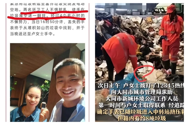 The report mentioned that two sanitation workers, disregarding the filth, searched through the garbage pile by hand. After more than 4 hours of effort, around 4:50 pm that day, the lost watch was finally found in the mountainous pile of trash and returned to Ms. Lu that same evening.