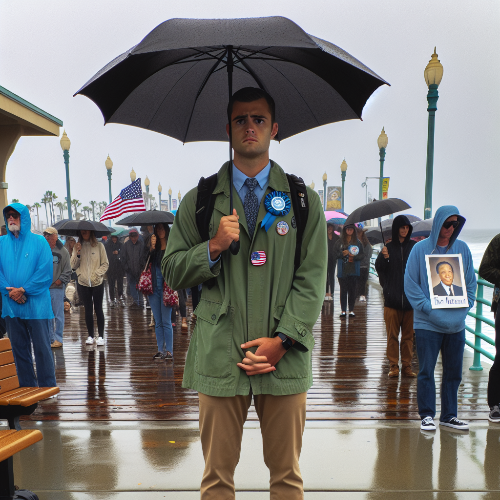 On October 14th, South Californians gathered at the Huntington Beach Pier to commemorate the National Day of Remembrance for Charlie Kirk, the founder of Turning Point USA, as well as Kirk’s 32nd birthday. Despite the typical sunny weather of Southern California’s autumn, it rained all day on the 14th until it finally stopped around 7 p.m. Candles and flowers were placed on the ground, with Charlie’s photo displayed as a tribute. Passing cars honked intermittently, and voices could be heard shouting, “Charlie Kirk!”