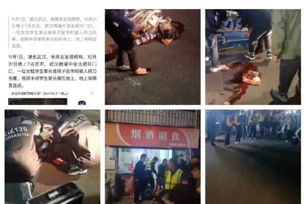 On November 1st, a netizen posted a video claiming that on the evening of October 31st around 7 pm, a parent of a student from the North Campus of Wuhan Nanhu Middle School was stabbed by someone when picking up their child after school. The video shows the parent lying on the ground with a pool of blood.
