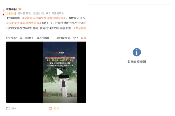 On August 18th, Mr. Fang from Qujing, Yunnan, told Xiangxiang Chenbao that on July 6th of this year, his 15-year-old daughter was killed by a 14-year-old male classmate from the same village named Jiang.